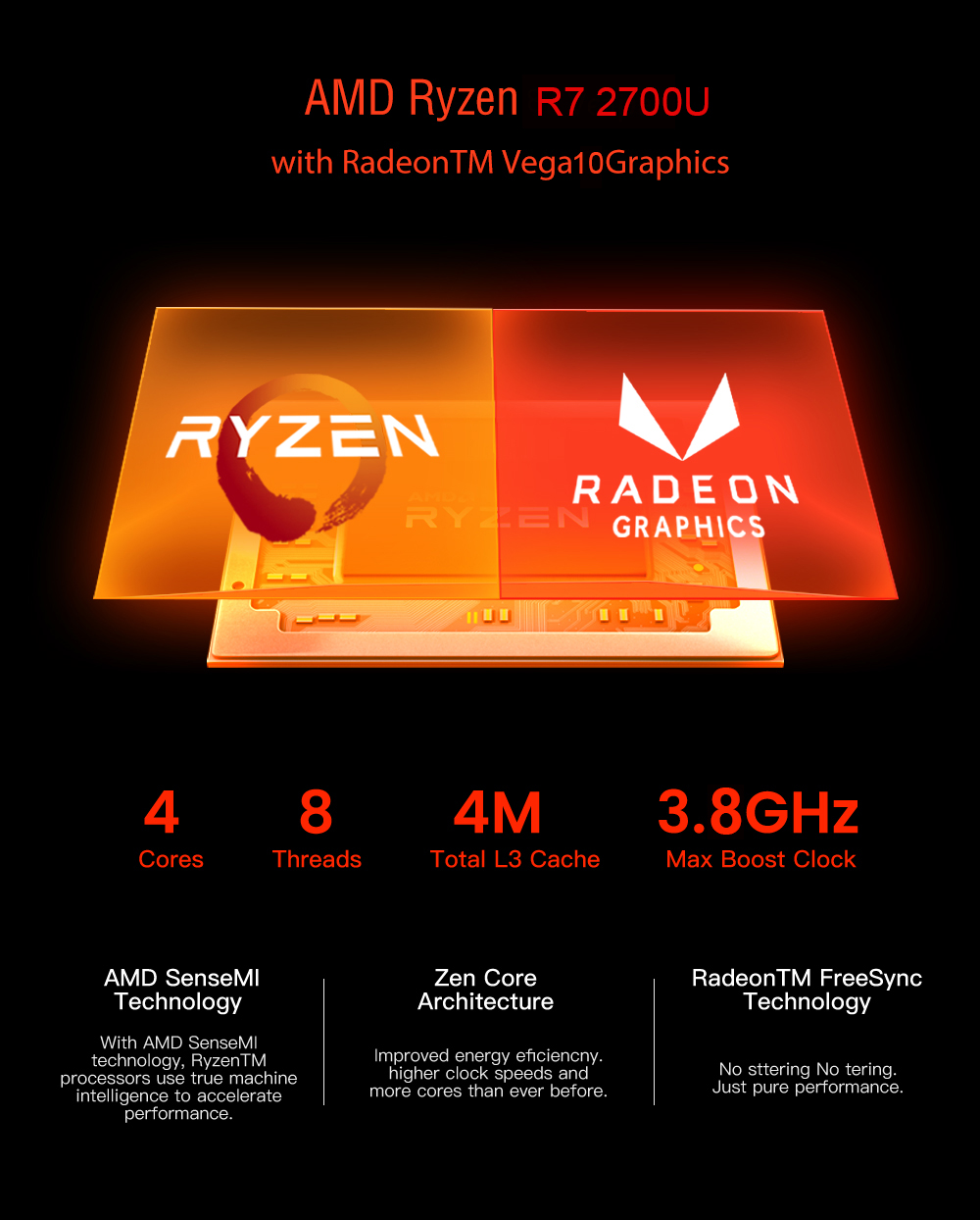 The laptop features an AMD Ryzen 7 2700U processor performing at up to 3.8 Ghz, 12 GB of dual channel DDR4 RAM and a 256 GB blazing fast SSD drive. Also a hot-swap micro-SD slot for up to 1 Terabyte of additional storage on the go.
