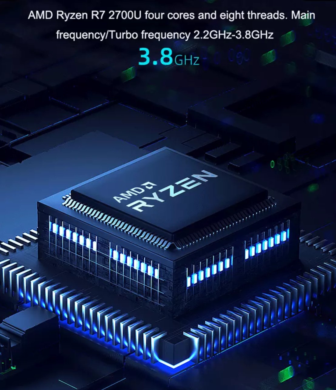 The laptop features an AMD Ryzen 7 2700U processor performing at up to 3.8 Ghz, 12 GB of dual channel DDR4 RAM and a 256 GB blazing fast SSD drive. Also a hot-swap micro-SD slot for up to 1 Terabyte of additional storage on the go.
